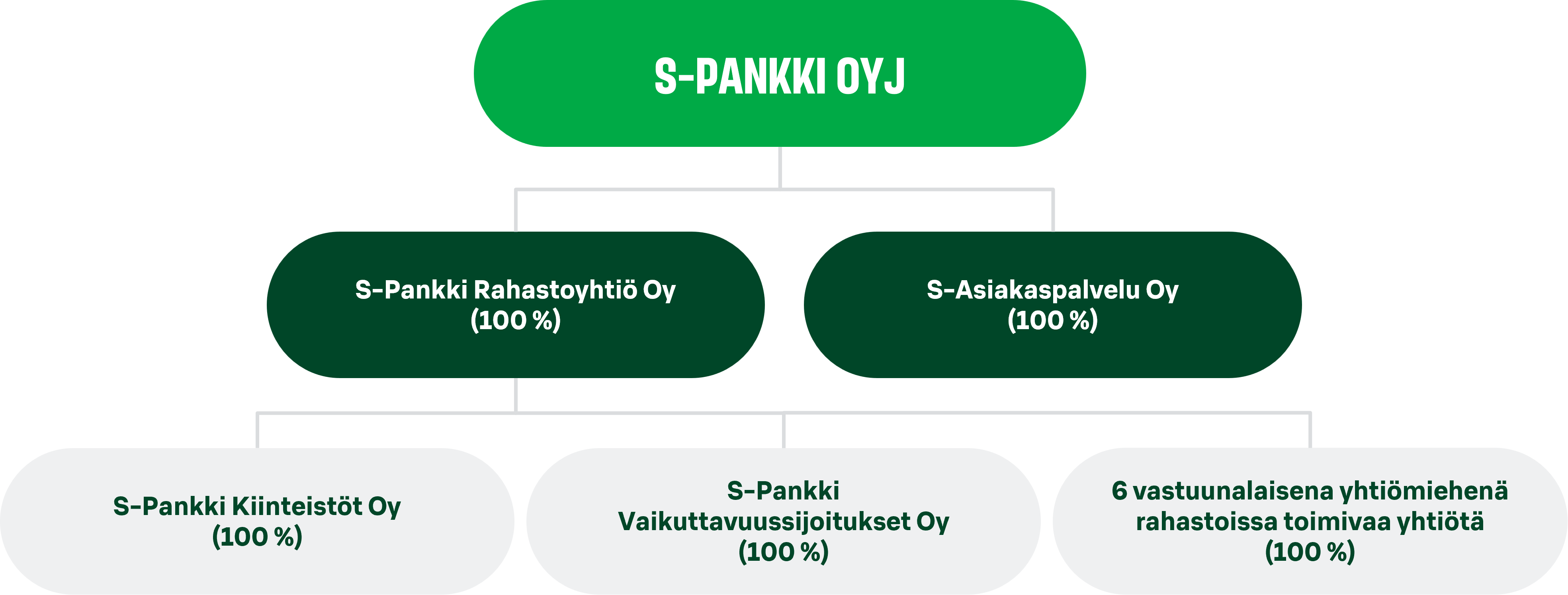 S-Pankki Oyj toimii S-Pankki-konsernin emoyhtiönä. S-Pankki on talletuspankki, joka harjoittaa luottolaitostoiminnasta annetun lain (8.8.2014/610) mukaista luottolaitostoimintaa. Pankki harjoittaa lain 5:n luvun 1 §:ssä tarkoitettua liiketoimintaa sekä siihen liittyvää toimintaa. Pankki harjoittaa myös lain kiinnitysluottopankeista ja katetuista joukkolainoista (11.3.2022/151) mukaista kiinnitysluottopankkitoimintaa. Pankki tarjoaa lisäksi sijoituspalvelulain (14.12.2012/747) 1 luvun 15 §:n mukaisia sijoituspalveluja. Pankki hoitaa emoyhtiönä konserniin kuuluvien yhtiöiden keskitetysti hoidettavat tehtävät, kuten konsernihallinnon, ohjauksen ja valvonnan.